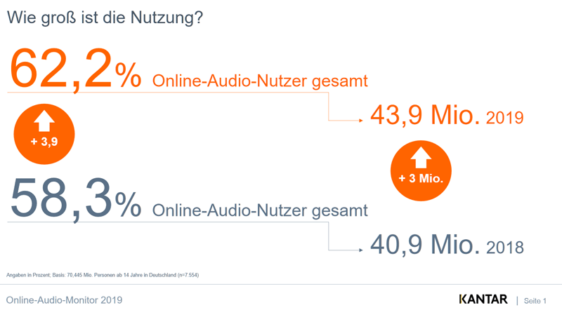 43,85 Millionen Menschen in Deutschland hören Online-Audio-Inhalte. Das sind drei Millionen mehr als im Vorjahr. Doppelt so viele Menschen wie vor einem Jahr nutzen inzwischen Smart Speaker, insgesamt 7,2 Millionen. Das sind zwei Ergebnisse aus dem aktuellen Online-Audio-Monitor 2019, der heute auf dem Digitalradiotag in Berlin von Landesmedienanstalten und Verbänden veröffentlicht wurde.