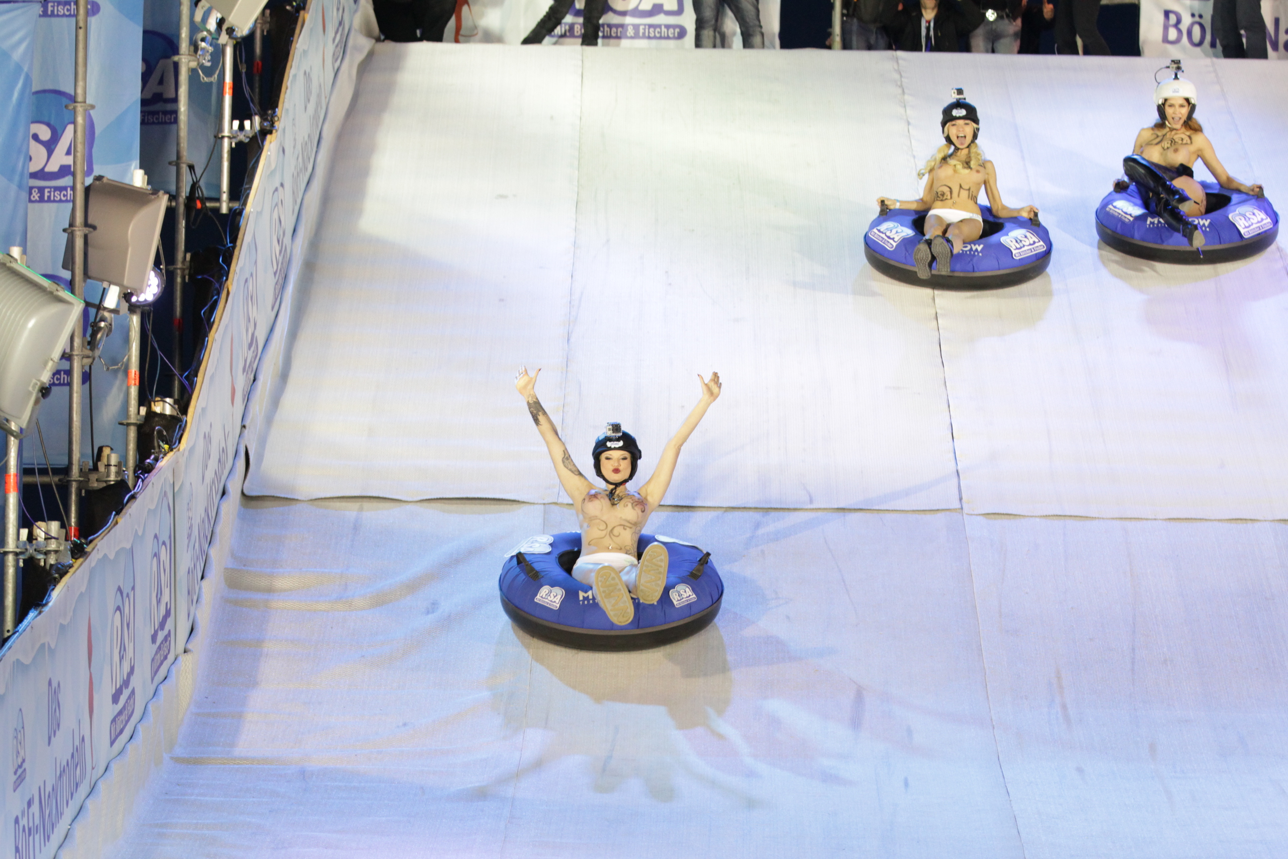 Mehr als 2.000 Besucher jubelten am Samstag beim dritten R.SANacktrodeln im Freizeitpark BELANTIS bei Leipzig. Am 28. Februar trafen sich Lokal-Matadorin Melanie Müller, Berufs-Nackedei Micaela Schäfer und Nacktsängerin Mia Julia sowie zahlreiche Pistennudisten, um die 10 Meter hohe und 40 Meter lange Piste hinab zu rodeln.