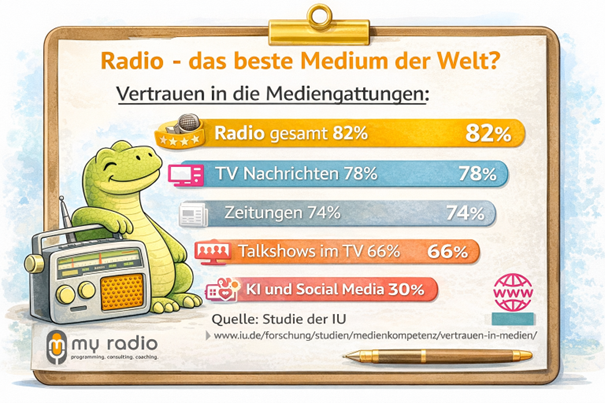 Im aktuellen Forsa-Institutionenranking (Stand Januar 2026) ist Radio erneut das vertrauenswürdigste Nachrichtenmedium in Deutschland. Dem Radio vertrauen 82 Prozent der Deutschen – damit liegt Radio vor TV-Nachrichten, vor Zeitungen, weit vor Social Media.