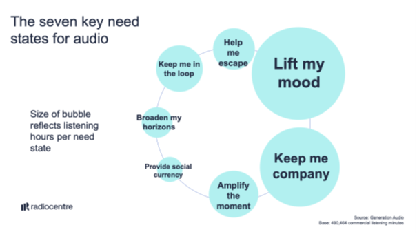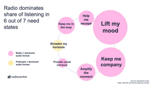 Denn Radio – und damit sind wir bei Good News Nr. 4 😊 – erfüllt sechs von sieben Bedürfnissen, die als Treiber für Audionutzung gelten, besser als andere Audio-Medien. Wenn es also darum geht, die Stimmung zu heben oder Gesellschaft zu haben, ist Radio das Medium Nummer 1.