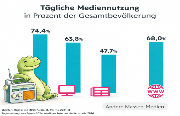 Die durchschnittliche Verweildauer liegt seit Jahrzehnten bei mehr als 4 Stunden pro Tag. Und das Beste: Diese ist in den vergangenen 20 Jahren nur minimal gesunken. Von 256 Minuten im Jahr 2005 auf 250 Minuten im Jahr 2026 (Quellen: ma 2025 Audio II, Radiozentrale). Das ist ein Verlust von 2,3 %. Erzähl das einmal einem Zeitungsverleger oder den Kollegen, die lineares Fernsehen betreiben… bei Letzterem liegt der Rückgang der Verweildauer über 20 Jahre bei ca. 20 Prozent. Über Zeitungen brauchen wir gar nicht zu reden.