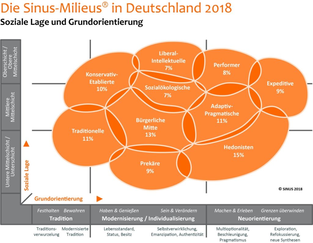 Details dazu findet man in den neuen Sinus-Milieus. Die Sinus-Milieus sind ein Gesellschaftsmodell. Sie fassen Menschen mit ähnlichen Werten und einer vergleichbaren sozialen Lage zu „Gruppen Gleichgesinnter“ zusammen.